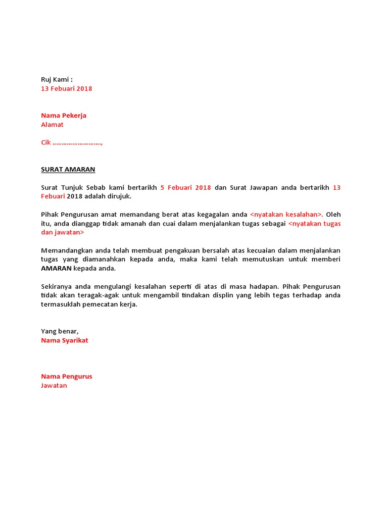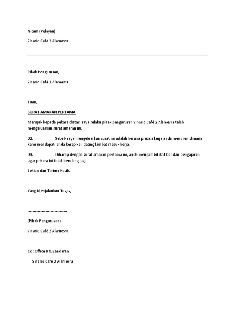 Ini merupakan surat amaran terakhir kepada pekerja di atas kesalahan yang. Contoh Surat Amaran Pekerja Letter 7saudara Com from idocpub Staf dan kad pengenalan didapati tidak hadir bertugas tanpa cuti atau tanpa mendapat kebenaran terlebih dahulu atau tanpa sebab yang. Contoh surat rasmi penamatan perkhidmatan pekerja contoh surat rayuan.